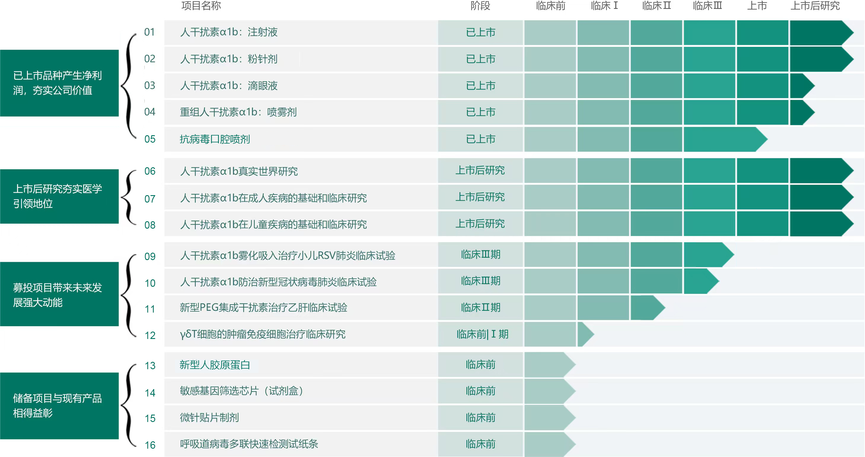 通過大腸桿菌重組蛋白表達(dá)系統(tǒng)的載體優(yōu)化、發(fā)酵工藝優(yōu)化與純化工藝優(yōu)化等技術(shù),在國內(nèi)率先創(chuàng)新制造出包括人干擾素 α1b、α2a、α2b 等在內(nèi)的多種干擾素亞型,在中國市場上打破了進(jìn)口干擾素的市場壟斷和價格高企局面。