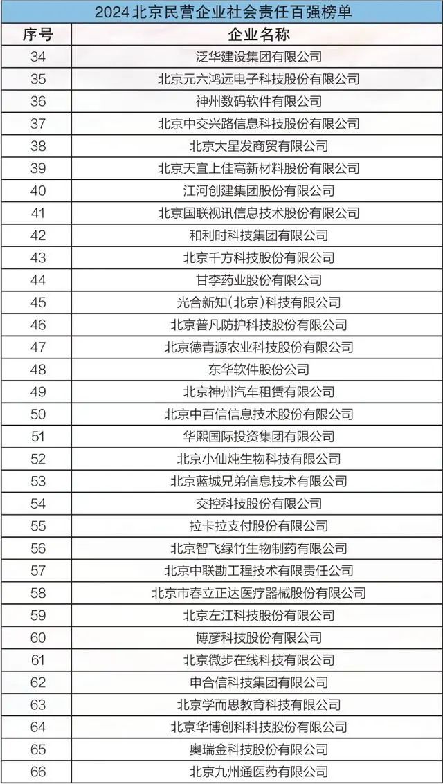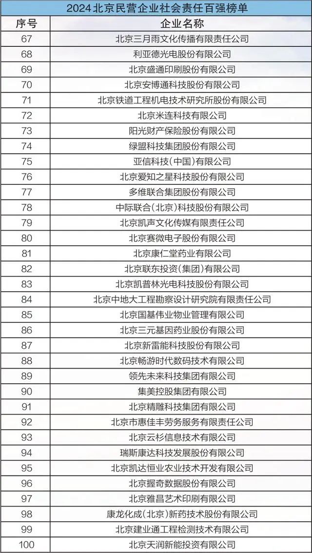 今年是北京民營企業百強發布的第七年。本次民營企業百強榜單發布以黨的二十屆三中全會精神為指引,深入貫徹市委十三屆四次、五次全會精神,對照進一步全面深化改革的新任務、新目標和新時代工商聯工作的新定位、新使命,優化調研評價指標體系,形成2024北京民營企業100強、科技創新100強、文化產業100強、中小企業100強、社會責任100強榜單。