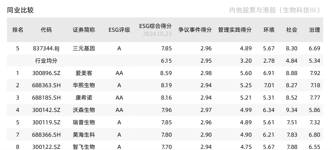 在Wind ESG評級中,ESG 綜合得分=管理實踐得分+爭議事件得分,ESG 管理實踐得分由環(huán)境,社會和治理維度得分構(gòu)成。在截至2024年10月23日的評級報告中,三元基因ESG綜合得分為7.85,管理實踐得分中,環(huán)境管理實踐得分為5.67,社會管理實踐得分為8.30,治理管理實踐得分為6.69,均高于行業(yè)平均水平。