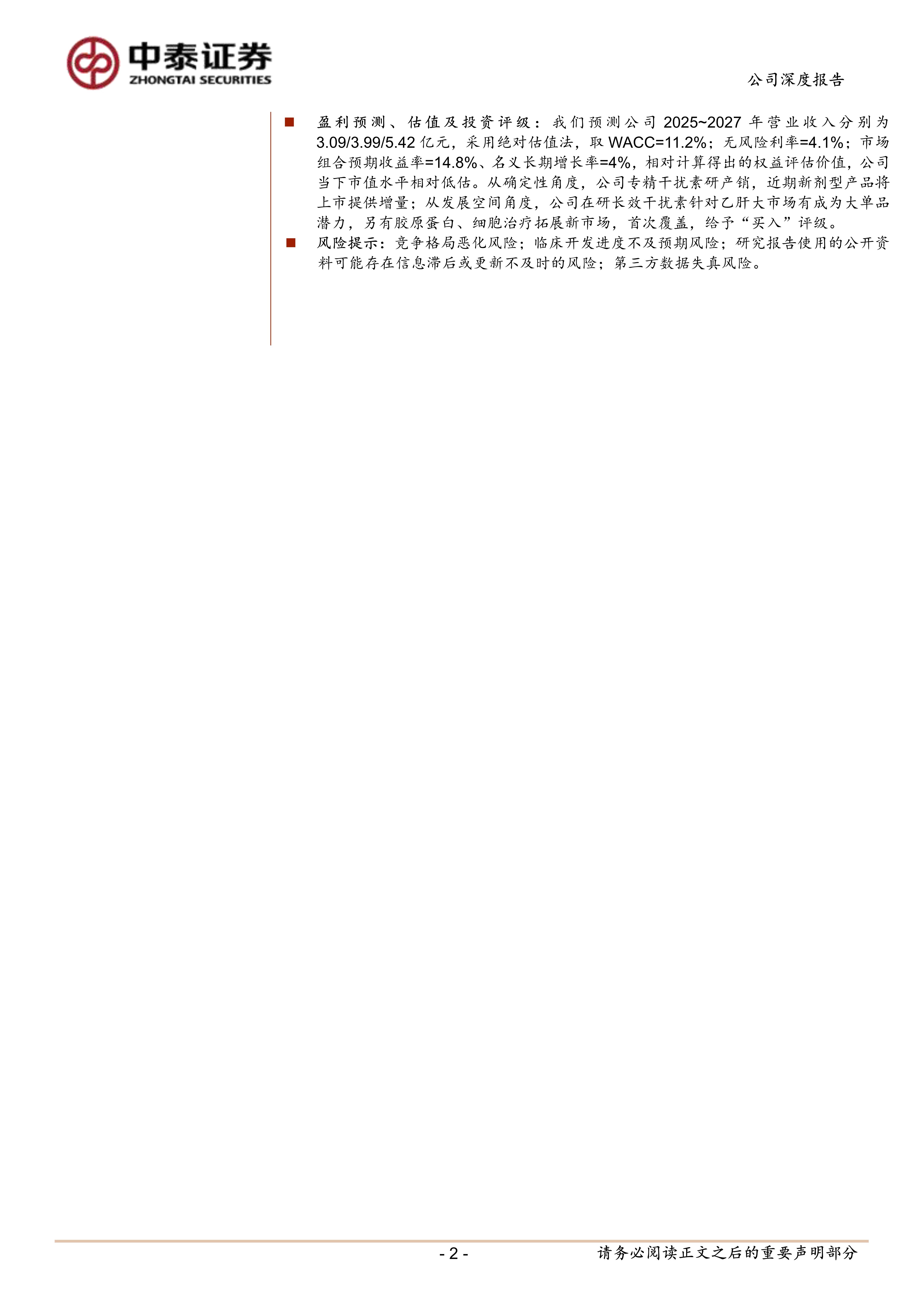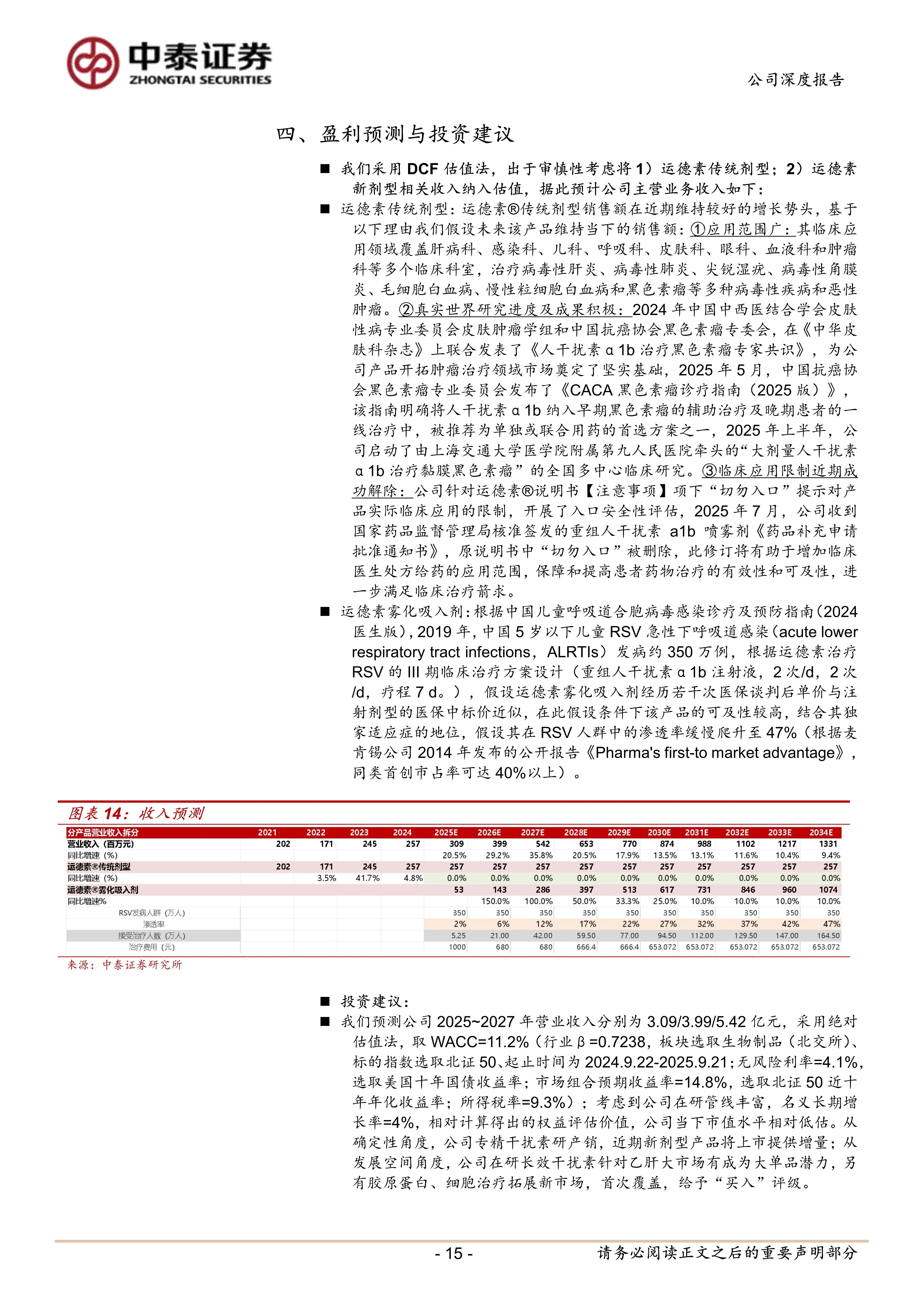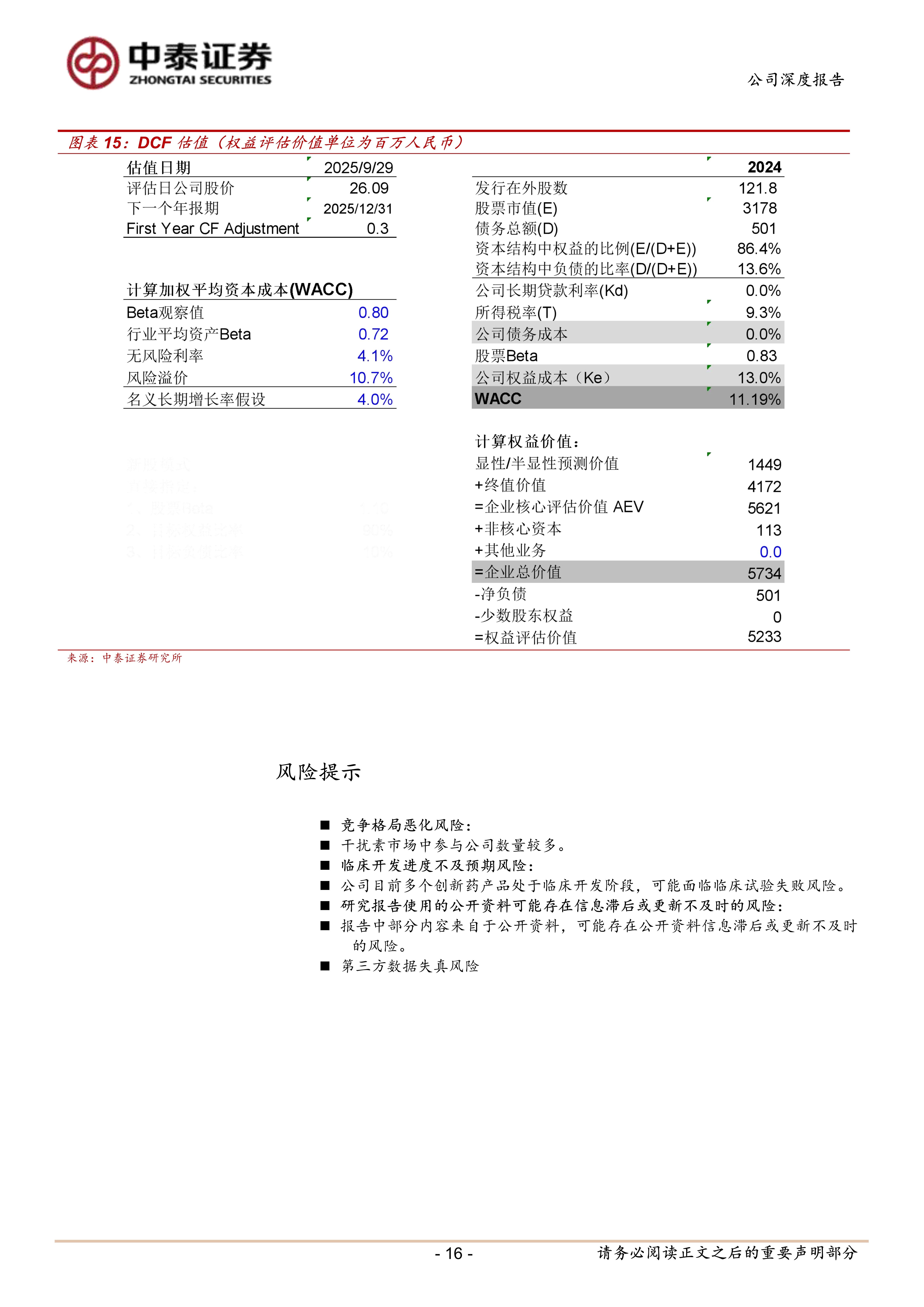 盈利預(yù)測、估值及投資評(píng)級(jí):我們預(yù)測公司2025~2027年?duì)I業(yè)收入分別為3.09/3.99/5.42億元,采用絕對(duì)估值法,取WACC=11.2%;無風(fēng)險(xiǎn)利率=4.1%;市場組合預(yù)期收益率=14.8%、名義長期增長率=4%,相對(duì)計(jì)算得出的權(quán)益評(píng)估價(jià)值,公司當(dāng)下市值水平相對(duì)低估。從確定性角度,公司專精干擾素研產(chǎn)銷,近期新劑型產(chǎn)品將上市提供增量;從發(fā)展空間角度,公司在研長效干擾素針對(duì)乙肝大市場有成為大單品潛力,另有膠原蛋白、細(xì)胞治療拓展新市場,首次覆蓋,給予“買入”評(píng)級(jí)。