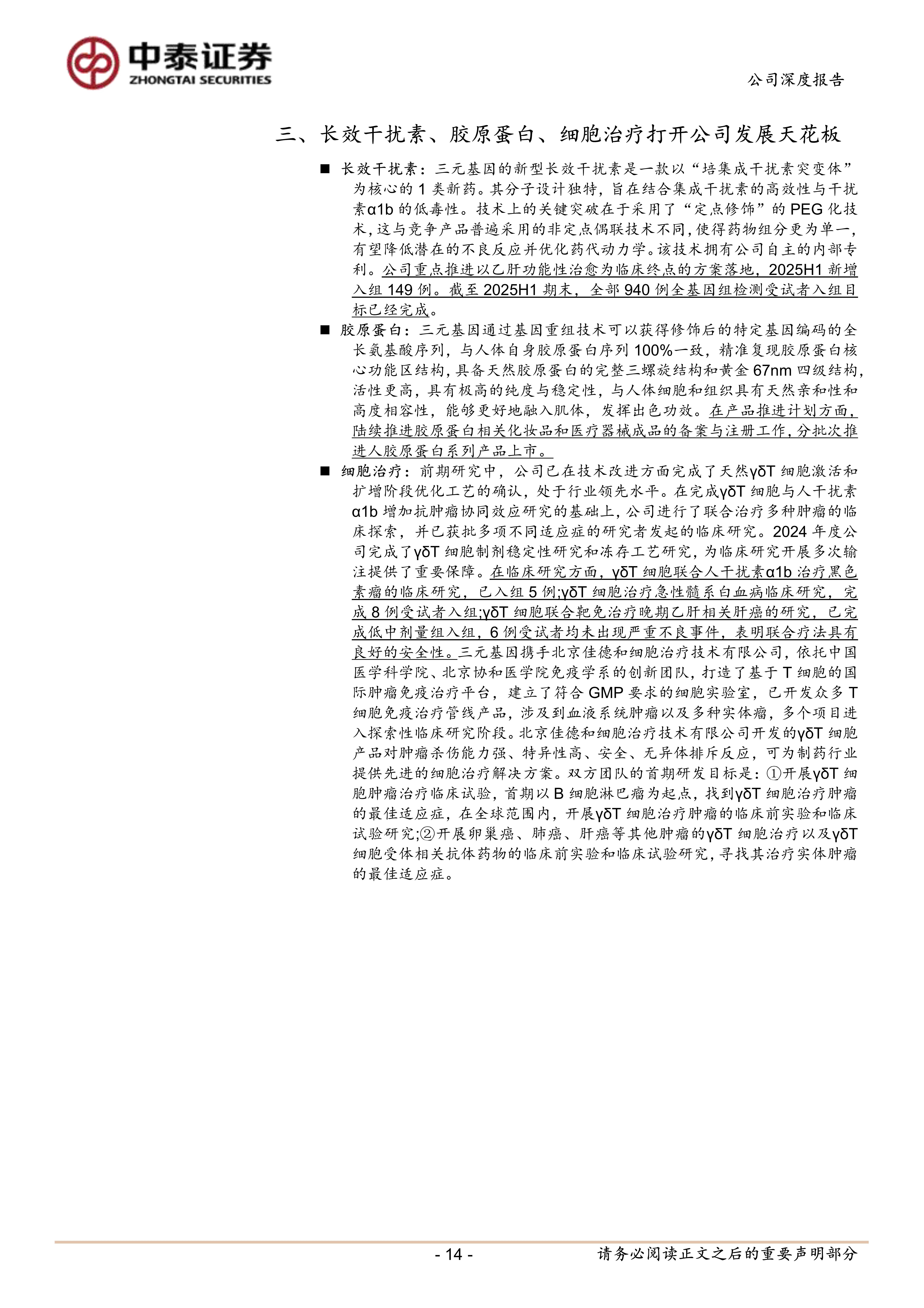 細(xì)胞治療:聯(lián)合干擾素抗腫瘤。前期研究中,公司已在技術(shù)改進(jìn)方面完成了天然γδT細(xì)胞激活和擴(kuò)增階段優(yōu)化工藝的確認(rèn),處于行業(yè)領(lǐng)先水平。在完成γδT細(xì)胞與人干擾素α1b增加抗腫瘤協(xié)同效應(yīng)研究的基礎(chǔ)上,公司進(jìn)行了聯(lián)合治療多種腫瘤的臨床探索,并已獲批多項(xiàng)不同適應(yīng)癥的研究者發(fā)起的臨床研究。2024年度公司完成了γδT細(xì)胞制劑穩(wěn)定性研究和凍存工藝研究,為臨床研究開展多次輸注提供了重要保障。在臨床研究方面,γδT細(xì)胞聯(lián)合人干擾素α1b治療黑色素瘤的臨床研究,已入組5例;γδT細(xì)胞治療急性髓系白血病臨床研究,完成8例受試者入組;γδT細(xì)胞聯(lián)合靶免治療晚期乙肝相關(guān)肝癌的研究,已完成低中劑量組入組,6例受試者均未出現(xiàn)嚴(yán)重不良事件,表明聯(lián)合療法具有良好的安全性。三元基因攜手北京佳德和細(xì)胞治療技術(shù)有限公司,依托中國醫(yī)學(xué)科學(xué)院、北京協(xié)和醫(yī)學(xué)院免疫學(xué)系的創(chuàng)新團(tuán)隊(duì),打造了基于T細(xì)胞的國際腫瘤免疫治療平臺(tái),建立了符合GMP要求的細(xì)胞實(shí)驗(yàn)室,已開發(fā)眾多T細(xì)胞免疫治療管線產(chǎn)品,涉及到血液系統(tǒng)腫瘤以及多種實(shí)體瘤,多個(gè)項(xiàng)目進(jìn)入探索性臨床研究階段。北京佳德和細(xì)胞治療技術(shù)有限公司開發(fā)的γδT細(xì)胞產(chǎn)品對(duì)腫瘤殺傷能力強(qiáng)、特異性高、安全、無異體排斥反應(yīng),可為制藥行業(yè)提供先進(jìn)的細(xì)胞治療解決方案。雙方團(tuán)隊(duì)的首期研發(fā)目標(biāo)是:①開展γδT細(xì)胞腫瘤治療臨床試驗(yàn),首期以B細(xì)胞淋巴瘤為起點(diǎn),找到γδT細(xì)胞治療腫瘤的最佳適應(yīng)癥,在全球范圍內(nèi),開展γδT細(xì)胞治療腫瘤的臨床前實(shí)驗(yàn)和臨床試驗(yàn)研究;②開展卵巢癌、肺癌、肝癌等其他腫瘤的γδT細(xì)胞治療以及γδT細(xì)胞受體相關(guān)抗體藥物的臨床前實(shí)驗(yàn)和臨床試驗(yàn)研究,尋找其治療實(shí)體腫瘤的最佳適應(yīng)癥。