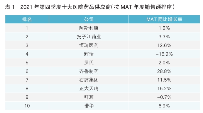 從不同企業類型來看,2021年第四季度,跨國企業銷售額約為616億元,同比下降0.9%;本土企業銷售額約為1614億元,同比增長3.5%。以季度銷售額、MAT年銷售額排名,阿斯利康、揚子江藥業、恒瑞醫藥位列企業排名前三??鐕髽IMAT年銷售額近2583億元,增速為6.3%;本土企業MAT年銷售額近6521億元,增速為10.4%(詳見表1)。