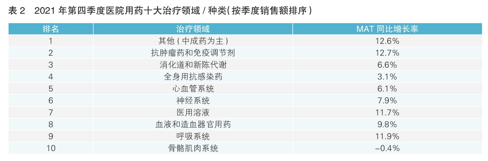 縱觀各大治療領域,2021年第四季度,中成藥在醫院市場的占比仍然位列第一,季度銷售額約為375億元,同比增長6.3%;MAT年銷售額約為1452億元,同比增長12.6%??鼓[瘤和免疫調節劑位列第二,季度銷售額約為315億元,同比增長5.2%;MAT年銷售額近1297億元,同比增長12.7%,增速位列所有品類第一(詳見表2)。