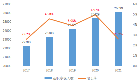 圖表2:2017-2021年在職職工參保人數(shù)統(tǒng)計 單位(萬人)