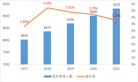 圖表3:2017-2021年退休職工參保人數(shù)統(tǒng)計 單位(萬人)