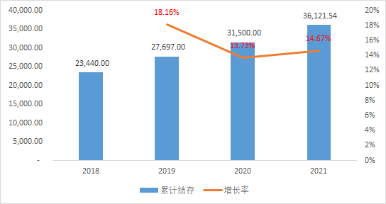 醫(yī)保累計結(jié)存增速較快,近4年年復合增長率達15.51%。截至2021年末,醫(yī)保累計結(jié)存36121.54億元。