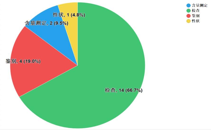 不符合規(guī)定項目包括性狀、鑒別、檢查和含量測定,不符合規(guī)定產(chǎn)品數(shù)量依次為1、4、14和2批次,分別占全部不符合規(guī)定項目的4.8%、19.0%、66.7%和9.5%(見圖6)。
