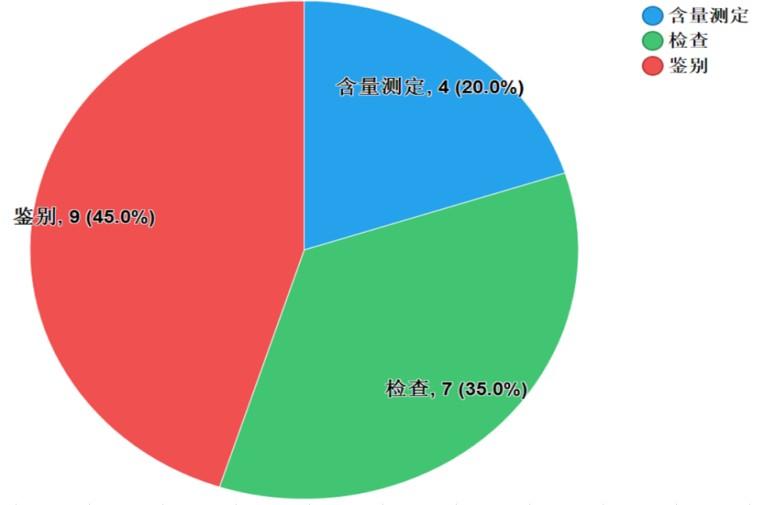 不符合規(guī)定項目主要涉及鑒別、檢查、含量測定等,不符合規(guī)定樣品批次依次為9批次、7批次和4批次,分別占全部不符合規(guī)定項目的45.0%、35.0%和20.0%(見圖8)。