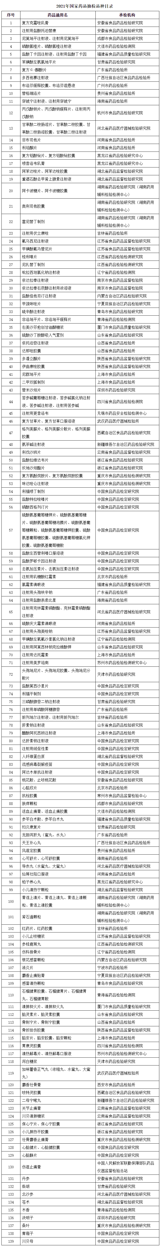 附表:2021年國家藥品抽檢品種目錄