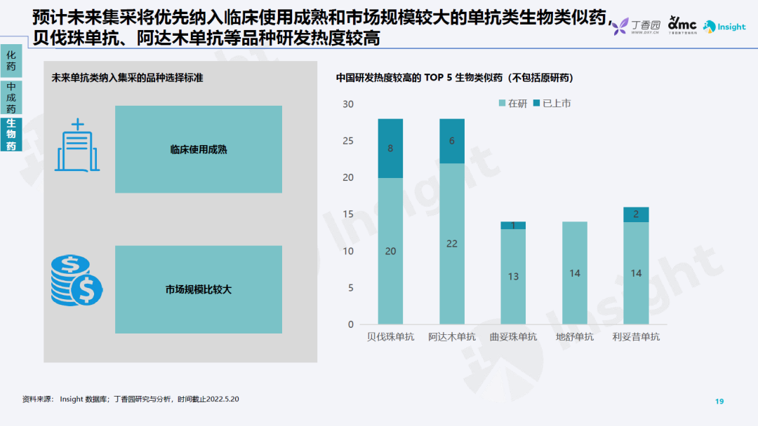 單抗類生物藥在省級集采中亦有突破,廣東11省聯盟首次把利妥昔單抗納入省級集采中,最終信達生物因價格最低獲得擬中選資格,羅氏和復宏漢霖獲得擬備選資格。預計未來集采將優先納入臨床使用成熟和市場規模較大的單抗類生物類似藥,如貝伐珠單抗、阿達木單抗等。