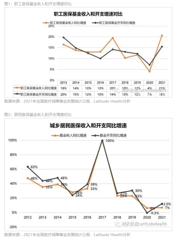 如果從基金收入和開支增速對比來看,職工醫保在2021年扭轉了自從2018年以來的不利局面,在連續3年的開支增速超過收入增速之后,變為收入增速超過開支增速。但居民醫保僅是在2020年出現了收入增速超過開支增速,2021年延續之前的趨勢,開支增速大幅超過收入增速。這說明職工醫保開源能力加強,尤其是通過持續納入類似靈活就業的參保人員方面。