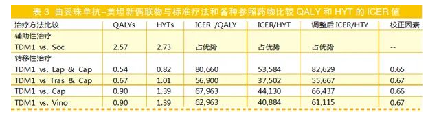 舉一個實際應用的例子。Buehrer比較QALY和HYT指標在HER2+乳腺癌治療中的應用。作者采用衛生經濟學模型比較曲妥珠單抗-美坦新偶聯物(TDM-1) (商品名 Kadcyla) 治療轉移HER2+乳腺癌與常規治療作為對照。對輔助性和轉移性 HER2+晚期乳腺癌進行各種化療治療方案比較,并對基線患者不同年齡和效用水平的差異進行敏感度分析。治療方案包括與拉帕替尼(lapatinib)、曲妥珠單抗、卡培他濱(capecitabine)、長春瑞士濱諾維本(vinorelbine)、聯合用藥或單藥治療比較。結果見表3。