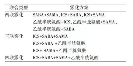 在我國常用ICS有布地奈德、丙酸倍氯米松和丙酸氟替卡松,SABA有沙丁胺醇和特布他林,SAMA有異丙托溴銨及其復合制劑,祛痰藥有乙酰半胱氨酸,抗感染藥物如僅有部分廠家的注射用兩性霉素B被批準用于霧化吸入治療嚴重的系統性真菌感染等,其余藥物國內目前無專用霧化吸入制劑,下圖為臨床常用霧化吸入聯合方案: